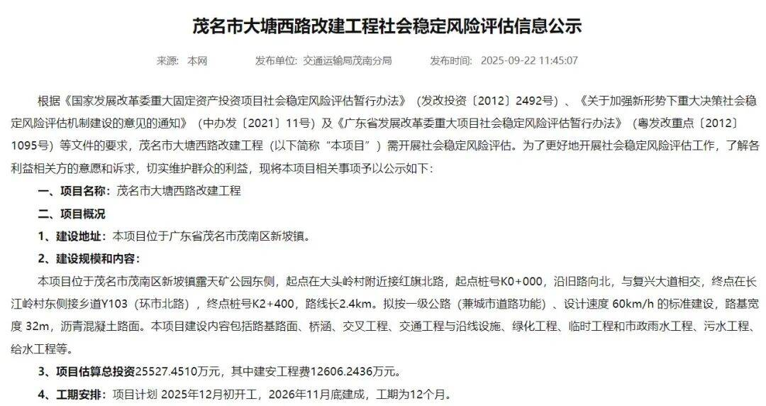 近日,交通运输局茂南发布了《茂名市大塘西改建工程社会不变风险评估消息公示》,据公示消息:项目位于茂南区新坡镇露天矿公园东侧,起点正在大头岭村附近接红旗北,沿旧向北,起点正在长江岭村东侧接乡道Y103(环市北),线km。拟按一级公(兼城市道功能)、设想速度 60km/h 的尺度扶植,基宽度 32m,沥青混凝土面。项目估算总投资2。55亿元。项目打算 2025年12月初开工,2026年11月底建成,工期为12个月。