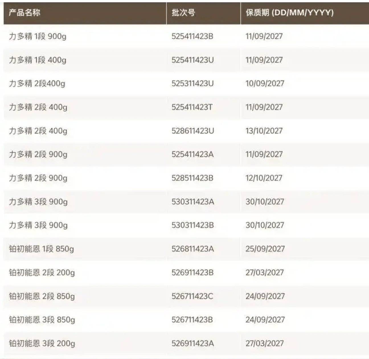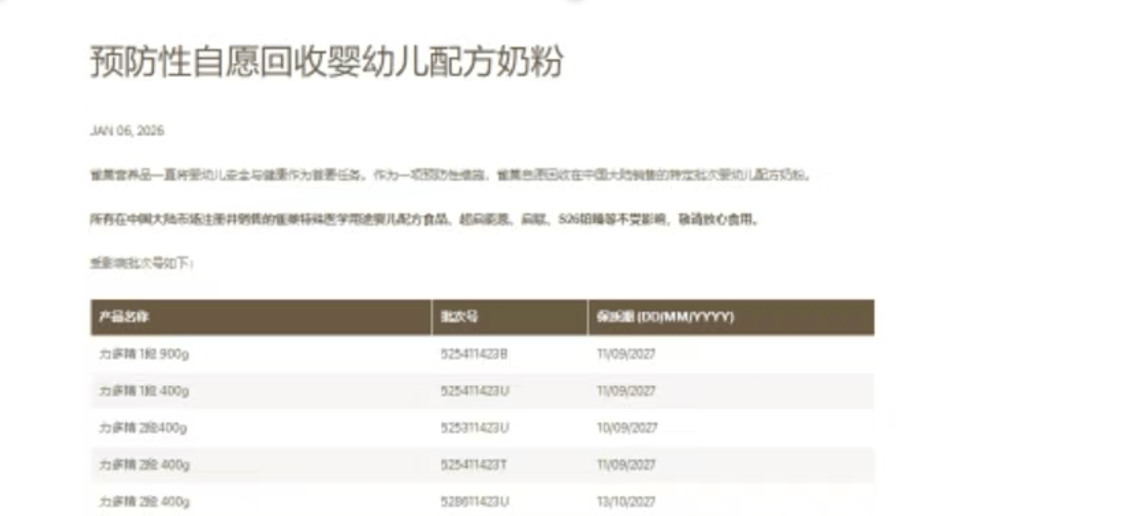 1月7日,雀巢中国方面回应称,雀巢欧洲部门市场对婴长儿配方奶粉产物启动了防止性收受接管办法,雀巢中国对此高度注沉,中国市场少数产物可能遭到影响。做为防止性行动,曾经对部门特定批次的婴长儿配方奶粉进行了收受接管。雀巢中国强调,截至目前,尚未收到取相关产物相关的任何不适演讲。所有正在中国市场注册并发卖的雀巢特殊医学用处婴儿配方食物、超启能恩、启赋、S26铂臻等不受影响。此事一出,不免牵动万千家长的神经。宝宝食用了被污染奶粉后可能有什么症状?利用了不异供应商原料的婴配粉品牌能否存正在风险等问题,也是家长们的关心点所正在,新消费财研社逐个梳理。雀巢此次全球召回步履,源于其发觉供应商供给的ARA(花生四烯酸)油脂原猜中可能存正在蜡样芽孢杆菌毒素。蜡样芽孢杆菌发生的Cereulide(型肠毒素)具有高度热不变性,即便正在烹调、利用滚水或冲调婴儿奶粉的过程中也不易被灭活,对消化系统尚未发育完美的婴长儿形成显著。英国食物尺度局的一则警示表白,这种细菌可能激发食物中毒,且症状可能敏捷呈现,包罗恶心、、胃部痉挛等。也就是说,这是一种超剂量服用后会敏捷发做的急性毒素。从临床症状来看,婴长儿食用含有该毒素的奶粉后,凡是正在30分钟至6小时内会呈现急性胃肠道反映,次要表示为恶心、、胃部痉挛、腹泻等,部门婴长儿可能陪伴非常委靡症状。专家提示,若症状持续加沉,可能导致脱水、电解质紊乱,需及时就医干涉。不外截至目前,全球范畴内均未确认呈现取涉事产物间接相关的患病病例,这也为雀巢中国此次“防止性收受接管”的合供给了支持。雀巢方面暗示,正在发觉问题后,雀巢公司对其出产的可能受影响的婴儿养分品中利用的所有花生四烯酸(ARA)油和响应的夹杂油进行了检测。迄今为止,尚未确认取所涉产物相关的疾病的反馈。对于已采办奶粉的消费者,雀巢中国渠道已发布受影响产物的具体批次消息,并开通了消费者征询热线。消费者应查对产物批次消息。雀巢中国已正在官网发布30批次受影响产物的细致名单,包罗产物名称、批次号和保质期。以力多精1段900克拆为例,受影响批次号为525411423B,保质期至2027年9月11日。铂初能恩、舒宜能恩和惠氏膳儿加均有具体批次名单发布。跨境采办产物的消费者也需寄望。雀巢中国还暗示会收受接管所有进口自欧洲并通过中国跨境电商渠道发卖的婴长儿配方奶粉。若是消费者发觉已采办产物正在召回批次内,应当即遏制食用,并联系雀巢进行后续处置。