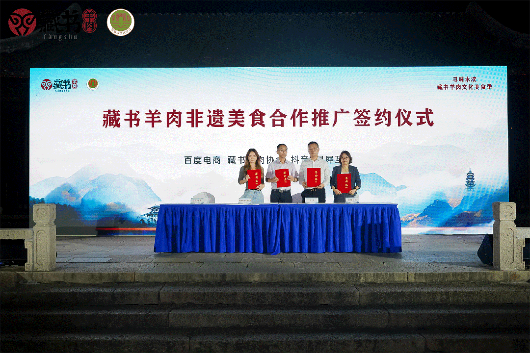 百度电商、灵犀互动三大平台代表取藏书羊肉协会代表;藏书羊肉非遗文化体验馆、玉桂楼、松大雅宴代表登台,配合签订藏书羊肉非遗美食合做推广和谈。